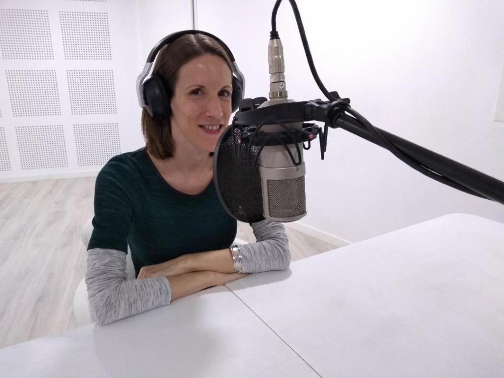 Photo of me wearing headphones, behind a microphone, in a white recording studio.