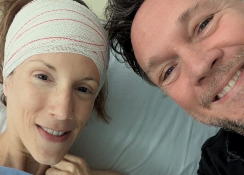 The surgeon came to see me and removed the bandage from my head. The pressure and instant pain release that happened when the bandage was removed one turn at a time felt wonderful! He cleaned and dressed the incision site, and to my partner’s delight, showed him how to do it himself before placing an elasticated band around my head to keep the dressing in place.
